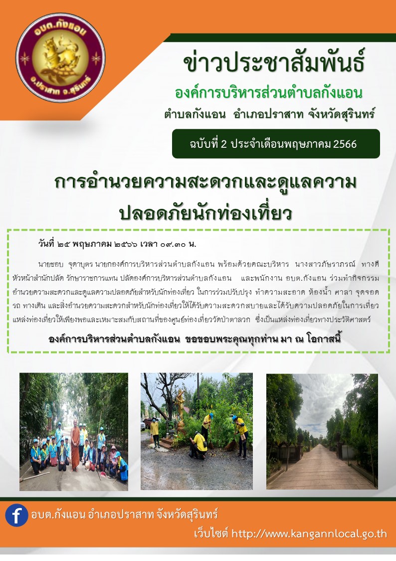 วันที่ 25 พฤษภาคม 2566 เวลา 09.30 น. นายชอบ จุดาบุตร นายกองค์การบริหารส่วนตำบลกังแอน พร้อมด้วยคณะบริหาร นางสาวภัษราภรณ์ ทางดี หัวหน้าสำนักปลัด รักษาราชการแทน ปลัดองค์การบริหารส่วนตำบลกังแอน และพนักงาน อบต.กังแอน ร่วมทำกิจกรรมอำนวยความสะดวกและดูแลความปลอดภัยสำหรับนักท่องเที่ยว ในการร่วมปรับปรุง ทำความสะอาด ห้องน้ำ ศาลา จุดจอดรถ ทางเดิน และสิ่งอำนวยความสะดวกสำหรับนักท่องเที่ยวให้ได้รับความสะดวกสบายและได้รับความปลอดภัยในการเที่ยวแหล่งท่องเที่ยวให้เพียงพอและเหมาะสมกับสถานที่ของแหล่งท่องเที่ยวทางประวัติศาสตร์